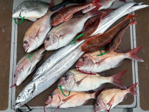 お初の御来船H様御一行チャーター便!…朝方風強い予報で出船遅らせて…GO! 色々な魚狙って見たいとのご希望で…幹事さんにサポート頂き…仕掛け・ルアーで用意してくれて… ベイトのレンタルタックル流用で可能と思われる釣り物の…ショットガンアジ・太刀魚・鯛ラバで狙いました! 前半戦ショットガンアジ…出船時まだ風残り風裏ポイント狙って嬉しいゲストのカマス混じりで…ぽちぽち! 中盤戦太刀魚…少し風落ちてきてポイントへ…浅場で細切れ反応ぶっつけ×2でポチンカ! サイズ狙って深場にも向けましたが…こちらは…時合いもはずしているようで…型見ず。 後半戦鯛ラバ…マゴチ・ホウボウ・太刀魚・エソ・サバフグ・サメ等…釣れてきましたが…本命は… 駆け足でしたが…幹事さんのスペシャルサポートで…それぞれ何かしら釣って頂けました。 参加の皆様…有り難う御座いました。…また機会が御座いましたら…宜しお願い致します。…m(_ _)m ![]() ![]() ![]() |