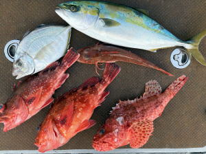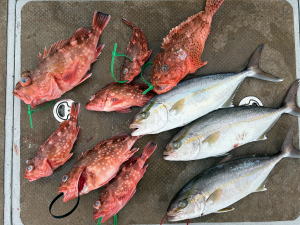 | Y様御一行チャーター便にて烏賊:鯛ラバ=8:2で狙いました! 烏賊ほぼ初挑戦との事で・・・胴付き仕掛けでモンゴウ狙ってみましたが・・・8ヒットの5杯! モンゴウ烏賊(”デンジャラスボム!?”)の取り扱い慣れていないと言う事で・・・写真は無し。(^^;) 上げ潮のこりの最後に潮止まりまで鯛ラバ狙って見ましたが・・残念ながらカサゴ・サバフグで・・・本命型見ず。 御予約時にお知らせさせている・・・タックル例・ルアー・仕掛けは実績の出ている物をお知らせしております。 近々で釣れている物なので・・・是非参考にして・・・ご準備下さい。・・・宜しくお願い致します。・・・m(_ _)m |